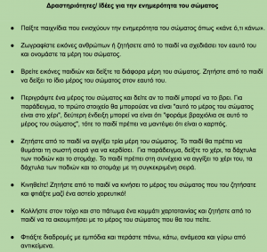 Υπάρχουν πολλοί τρόποι για να βοηθήσετε τα παιδιά να αναπτύξουν την ενημερότητα του σώματος. Ξεκινήστε δείχνοντας και προσδιορίζοντας τα μέρη του σώματος. Χρησιμοποιήστε πολύ απλές εντολές στην αρχή, όπως «κλώτσα με το πόδι», «κούνα το χέρι ή το κεφάλι». Στη συνέχεια προχωρήστε σε κινητικές εντολές όπως “άγγιξε τον αγκώνα σου”. Έπειτα δοκιμάστε πιο δύσκολες εντολές, όπως “άγγιξε το δεξί σου γόνατο”.